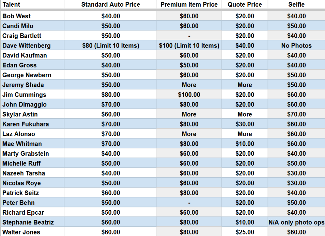 table prices: